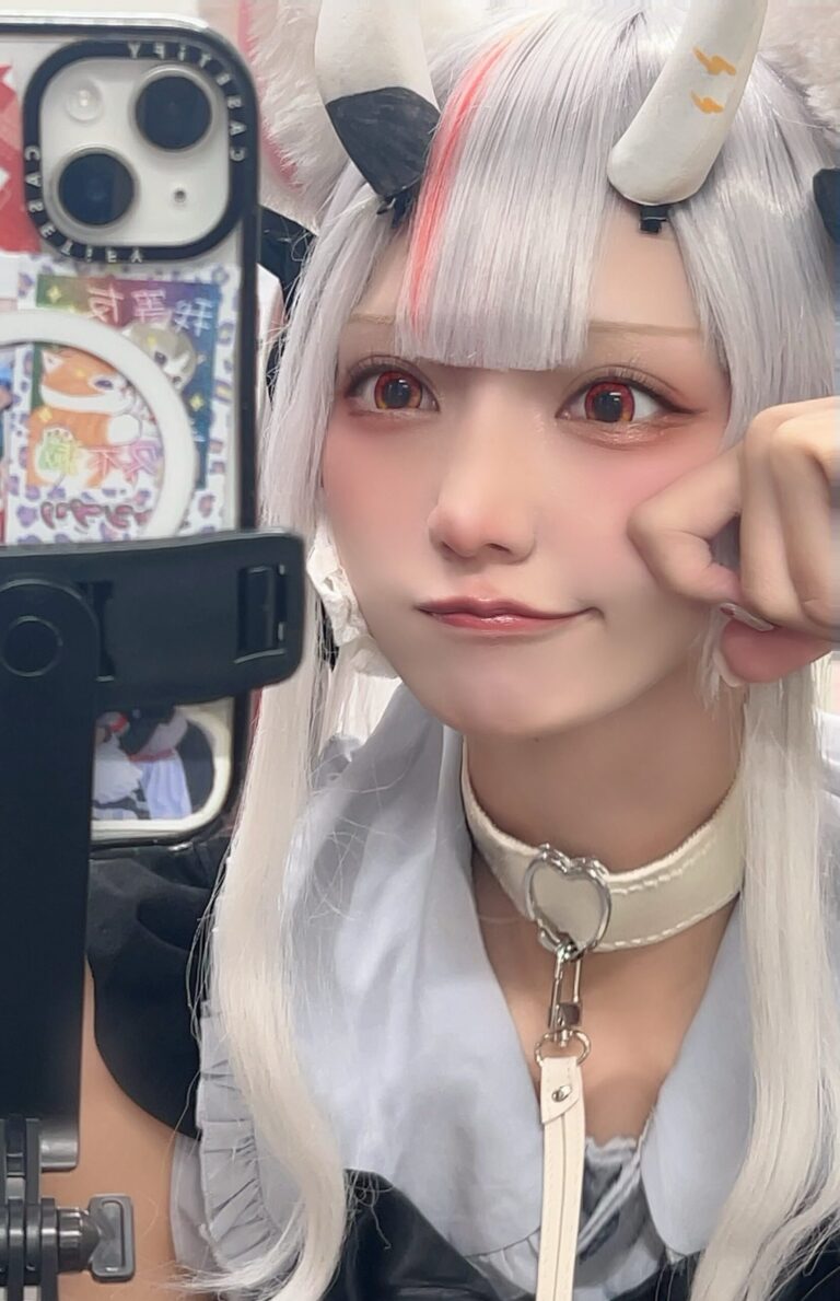 Tags: hololive, nakiri ayame, detached sleeves, glasses, gloves, hair buns, horns, kemonomimi, makeup, mouth mask, oni, painted nails, stockings, very long hair, vtuber, non-nude