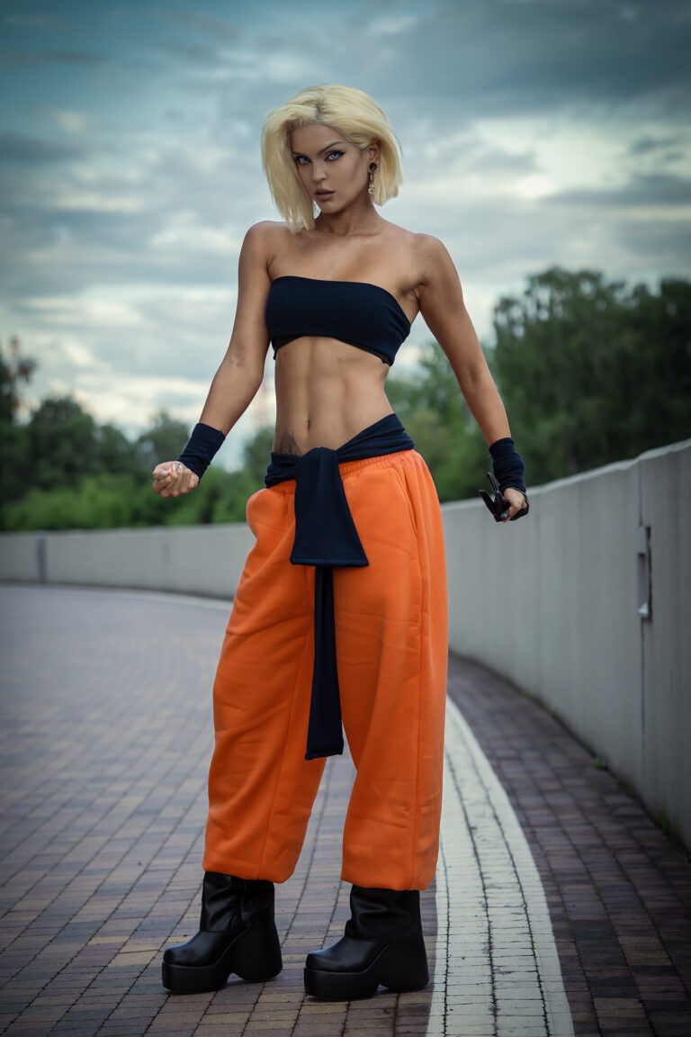Tags: dragon ball z, android 18, andrasta, gloves, high heels, large tattoo, makeup, muscle, painted nails, non-nude