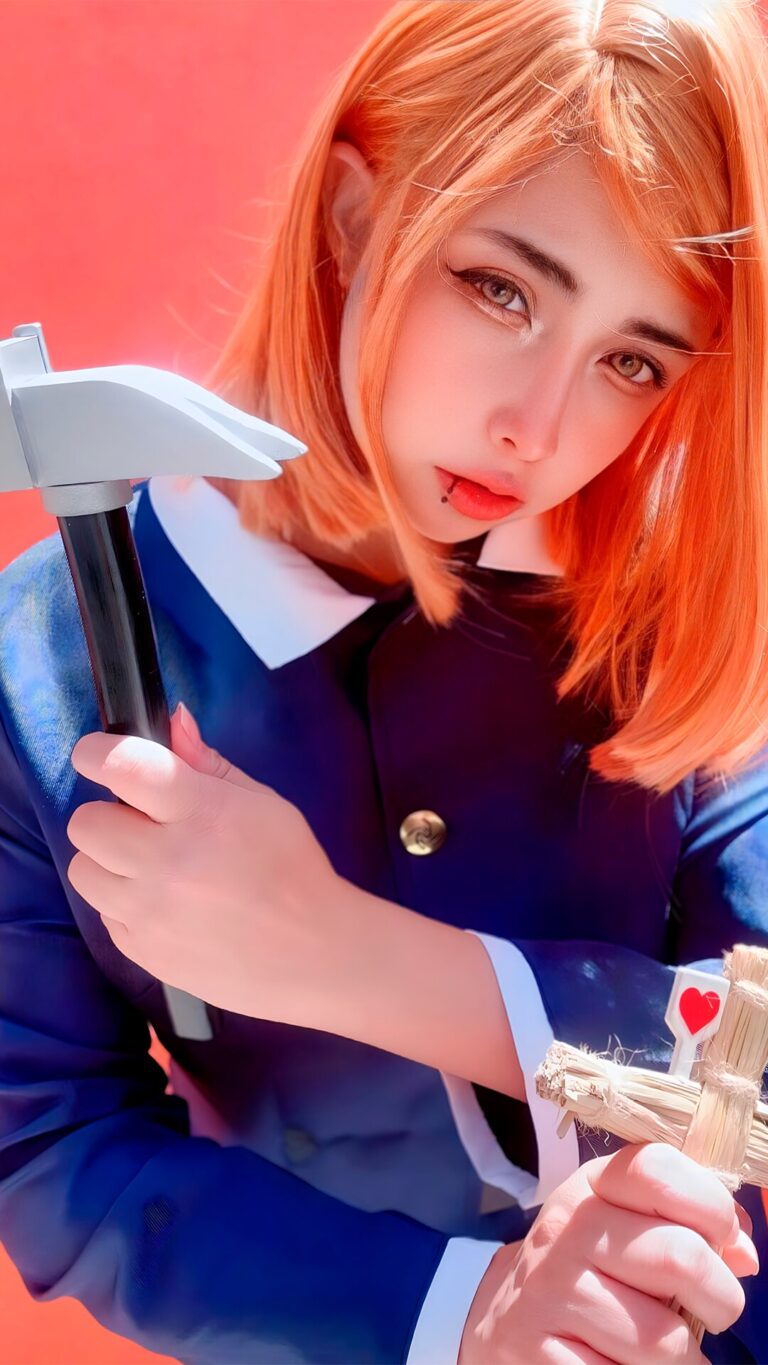 Tags: jujutsu kaisen, nobara kugisaki, arelly trujillo, large tattoo, makeup, painted nails, piercing, schoolgirl uniform, non-nude